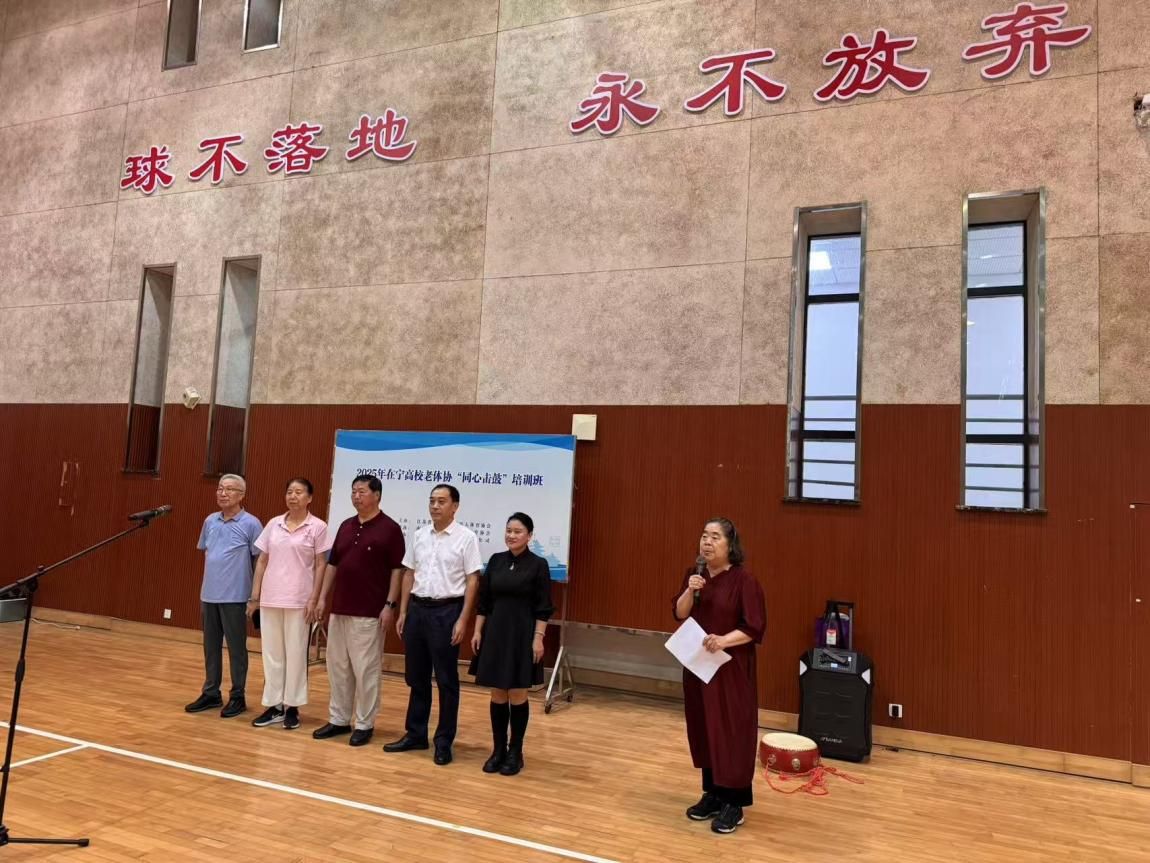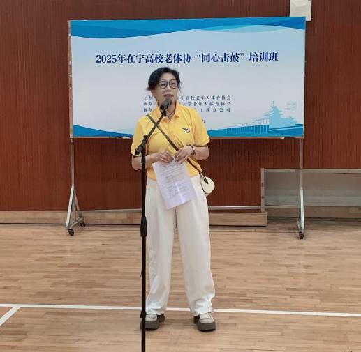 6月21日,由江苏省在宁高校老年人体育协会主办、南京农业大学承办的2025年“同心击鼓”专项技能提升培训班在南京农业大学体育中心辅馆正式开班。来自南京大学、东南大学、南京理工大学、河海大学等22所在宁高校的近50名老年体育骨干齐聚一堂,共同开启这场融合体育竞技与团队协作的创新培训之旅。江苏省在宁高校老体协理事长胡连城、常务副理事长兼秘书长史延惠,南京农业大学离退休工作处党总支书记、处长钱德洲、校老体协理事长张剑仲,以及中国平安保险公司江苏分公司经理张文等嘉宾出席开班仪式。