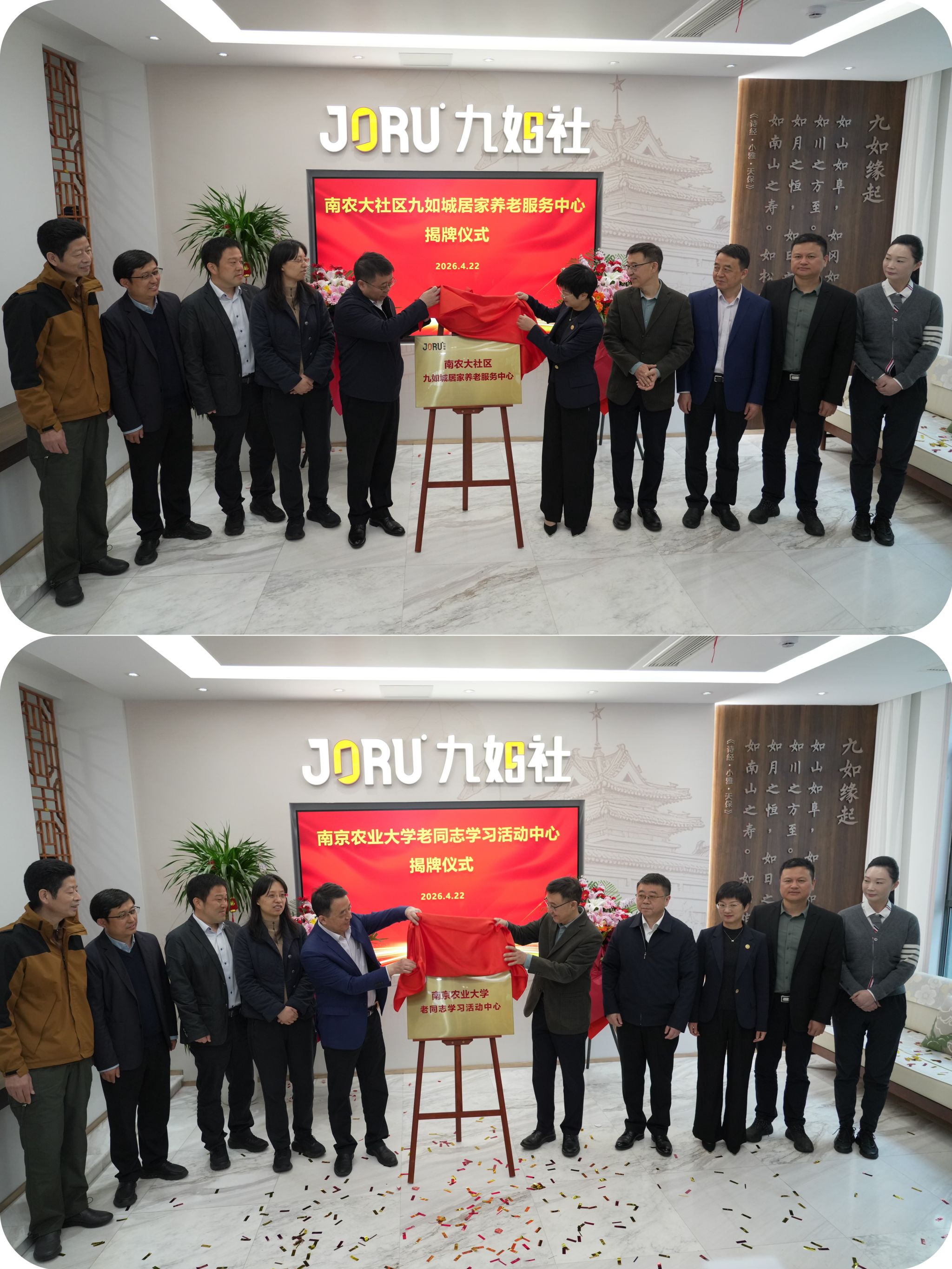 4月22日,南农大社区九如城居家养老服务中心与南京农业大学老同志学习活动中心在卫岗校区揭牌运营,学校探索“校地企”三方协同养老模式,为广大离退休教职工及周边居民搭建起养老服务与终身学习于一体的综合性平台。